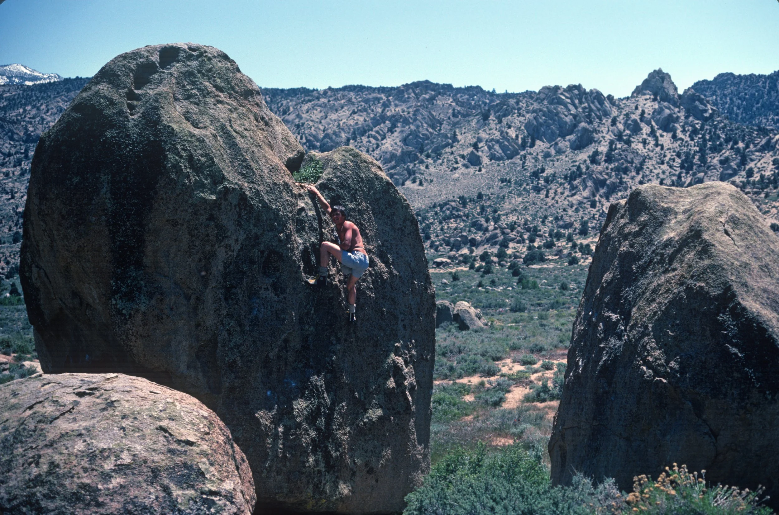 In this week’s Founder’s Note, Ken Yager recalls a story from 1979; after moving to Mammoth Lakes for a ski-area job, he made his first trip to the Buttermilks with Yosemite friend Grant Hiskes. The adventure began with rough skiing lessons at Mammoth and a harrowing hitchhike to Bishop in a reckless Dodge Charger, but ended with moonlit boulders, Sierra views, and two days of memorable climbing. Ken fell in love with the Buttermilks on that first visit and returned often over the next five winters.